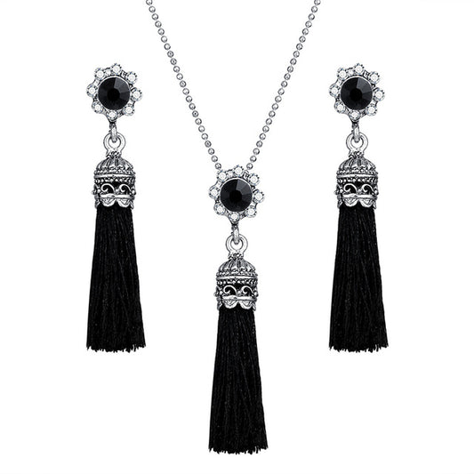 AY Fashion Tassel Flower Drop Jewelry Set For Women Black Color Long Necklace Pendant Crystal Earrings Wedding Jewelry Gift